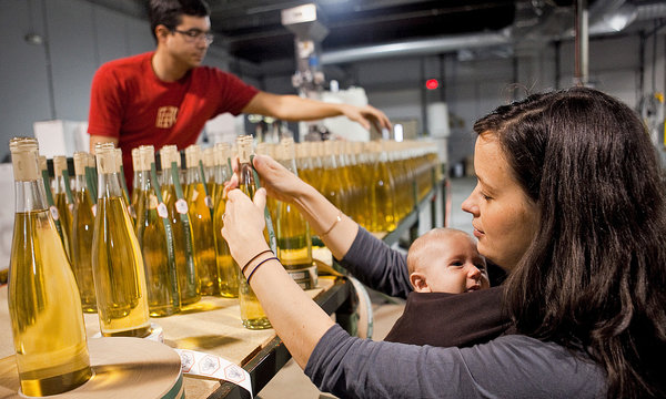 Carly Cope, with son Laughlin, on the bottle-labeling line at Maine Mead Works, which she and her husband, Ben Alexander, own. Credit Craig Dilger for The New York Times